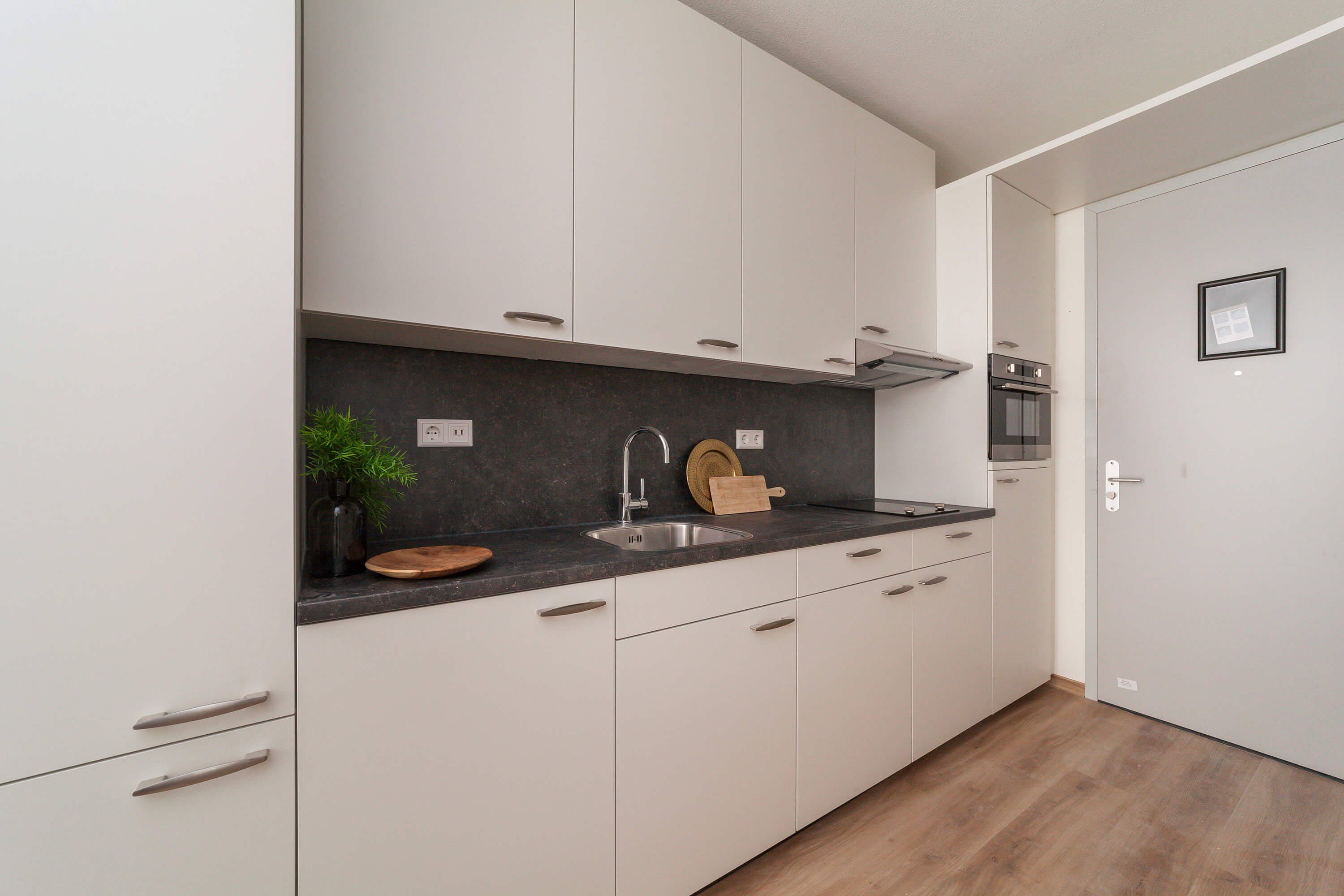 Deze woning is een gestoffeerde studio om je direct thuis te voelen in de Startmotor Community. De woning heeft een PVC-vloer, vitrage, overgordijn en afgewerkte wanden. Je hebt een eigen keuken met inbouwapparatuur, extra opbergruimtes, en bovendien een eigen badkamer met inloopdouche en wasmachine aansluiting.